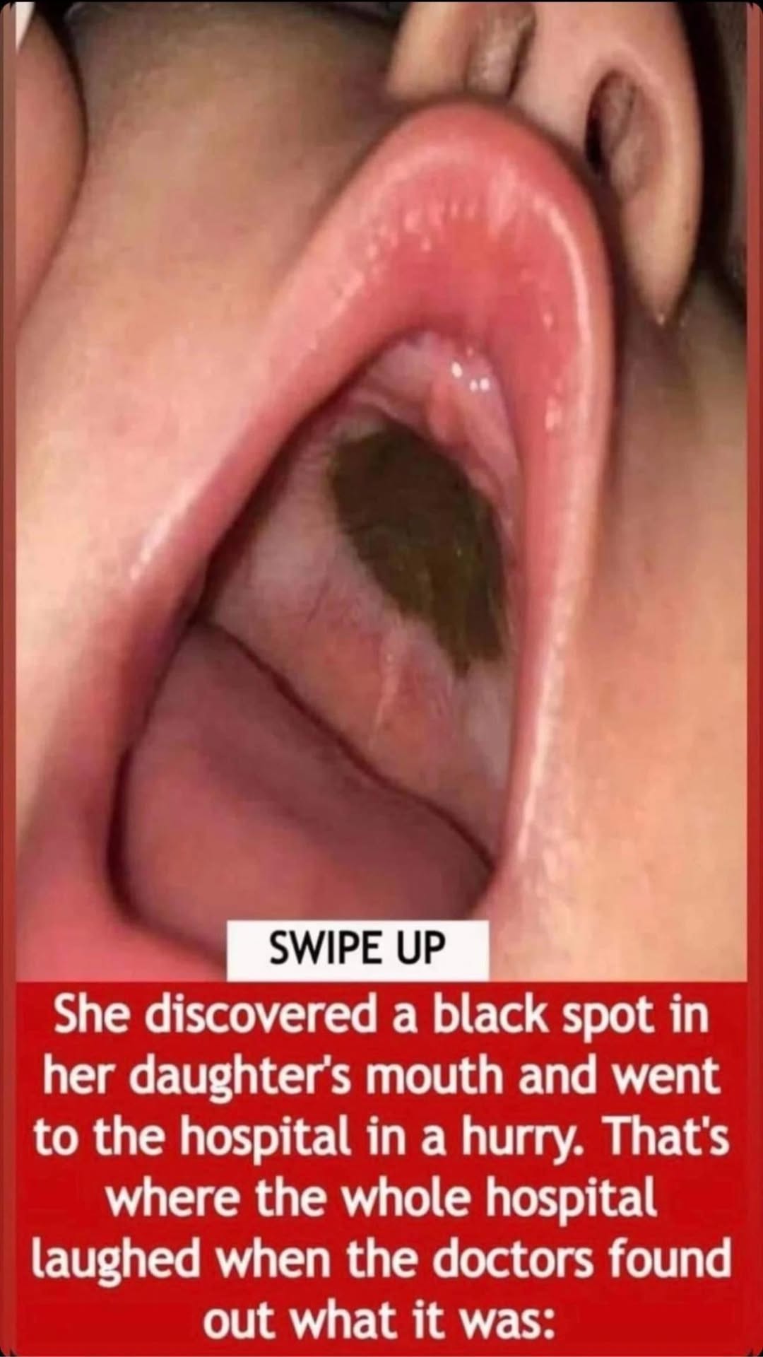 While playing with her child, a mother noticed something that left her disturbed. On the hard palate inside the girl’s mouth was a huge black patch the mom never noticed before. She tried erasing it but it did’t go away so she rushed her girl to the hospital. Once there, doctors examined it thoroughly and their initial thoughts were it was a birthmark. But how was it possible for the mother not to notice it for so long? “Today, while playing with Bella, I noticed a smear on her mouth. I tried to erase it to see if it would go away, but it didn’t. I called everyone and then scheduled a 30-minute appointment with the doctor,” the mother wrote on Facebook. The mom was sure it couldn’t be a birthmark because she said she cleaned her daughter’s mouth every single day and it wasn’t possible for the patch to be there from before. Other doctors tried examining Bella and what they discovered made everyone laugh. It turned out that what appeared as a huge birthmark was in fact a piece of a cardboard the little one put in her mouth while no one was watching.
