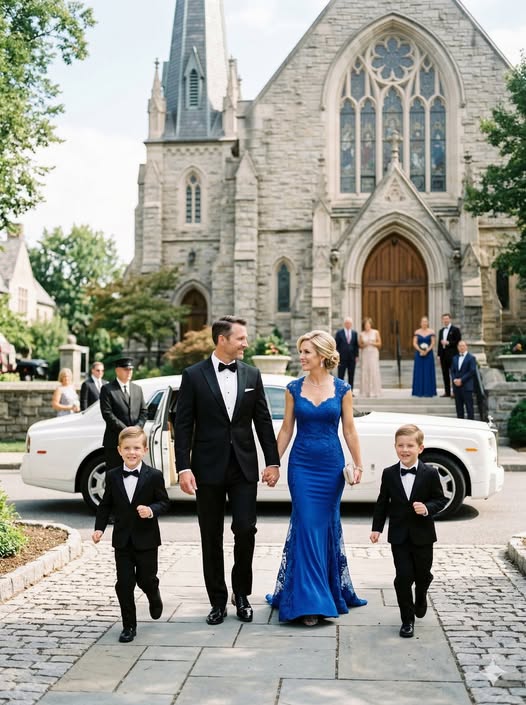 Lucas and Adrian emerged first, adjusting their jackets with the seriousness of young men determined to behave properly. Then I stepped onto the pavement, the blue dress moving softly in the evening breeze.