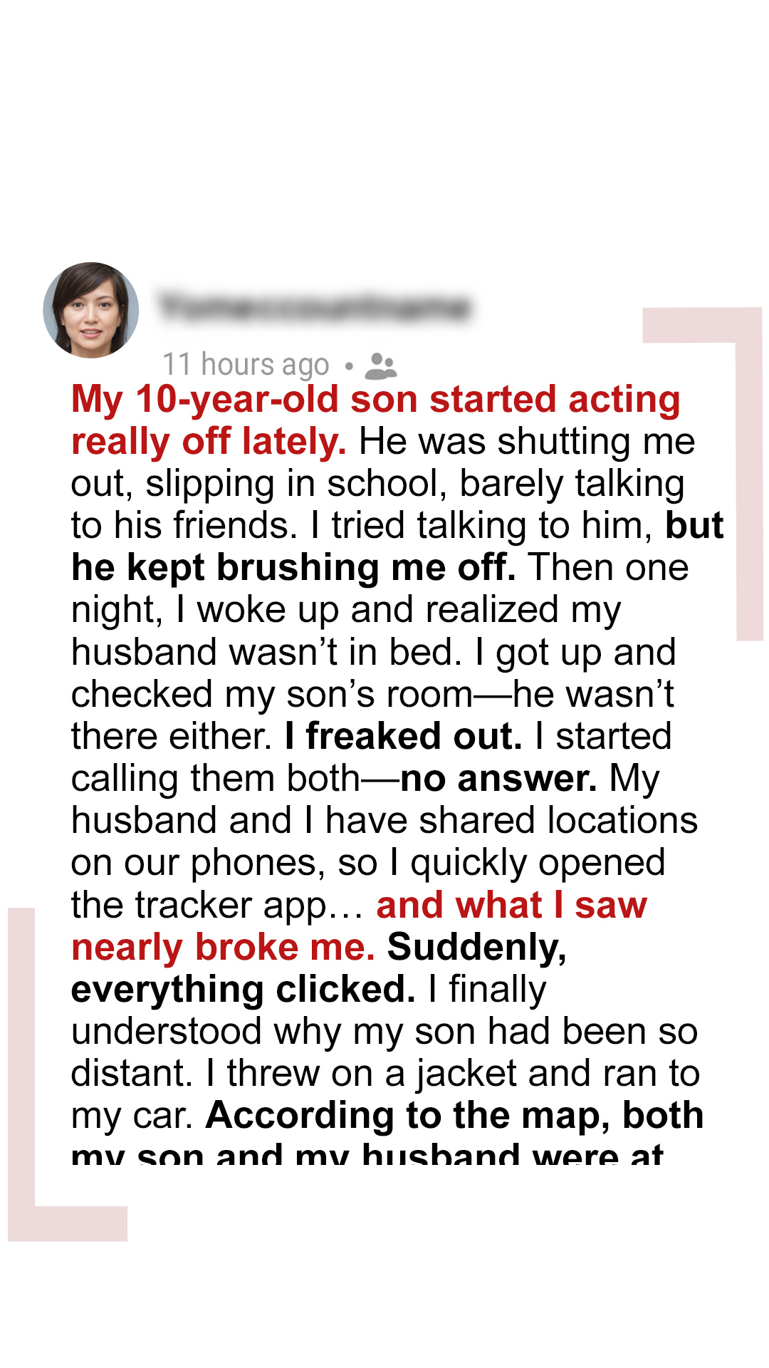 When my 10-year-old son started acting distant, I chalked it up to mood swings and figured it was just a phase. But one night, I woke up and realized he and my husband were both gone… and nothing could have prepared me for where I’d find them. There are moments that split your life in two: before and after. I’ve had a few of those: losing my first husband when my son was just a baby… and finding love again six months later. I’m Edith. I’m 35. And I have a son named Coby whom I love more than my own breath. His father died when Coby was just eight months old. A car crash. I barely remember that year. Just grief, formula bottles, and me sleepwalking through life. Then came Dave. He was my late husband’s friend’s brother. He was kind, patient, and somehow… he never made me feel like damaged goods. He didn’t just take care of me… he took care of Coby like he was his own. We never told Coby the truth. I always told myself there’d be a “right time.” But that right time never came. Not at five. Not at eight. Then suddenly, when Coby was 10, something shifted. He started acting… off.