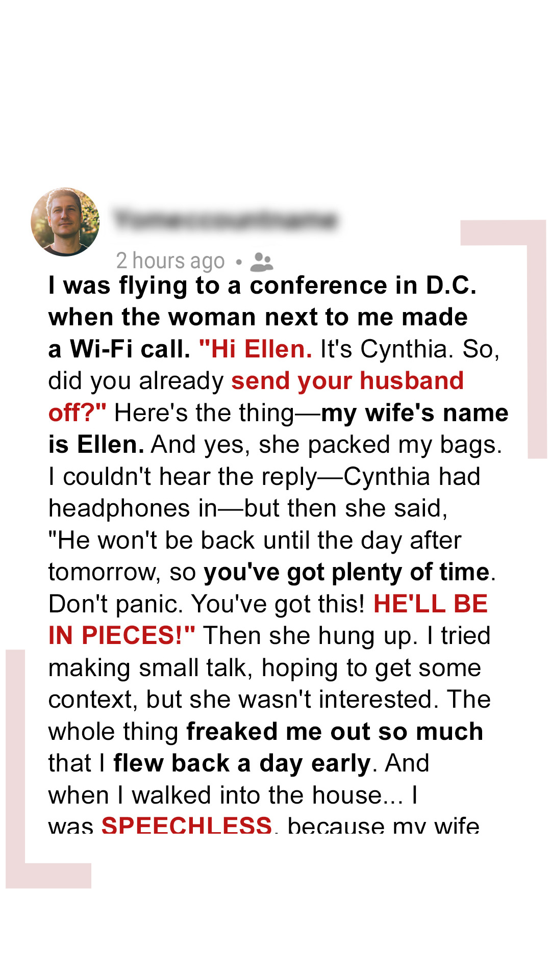 On a flight to D.C., a husband overhears a chilling call: “Did you send your husband off?” followed by, “He’ll be in pieces.” The caller? A stranger. The name she used? His wife’s. Panic takes hold — what is Ellen hiding? He flies home early… and what he finds leaves him speechless. I was settling into my aisle seat when the woman in 12B said my wife’s name during her phone call. I didn’t mean to eavesdrop (honestly, I was just trying to find my headphones in my bag), but when I recognized the name, it caught my attention.