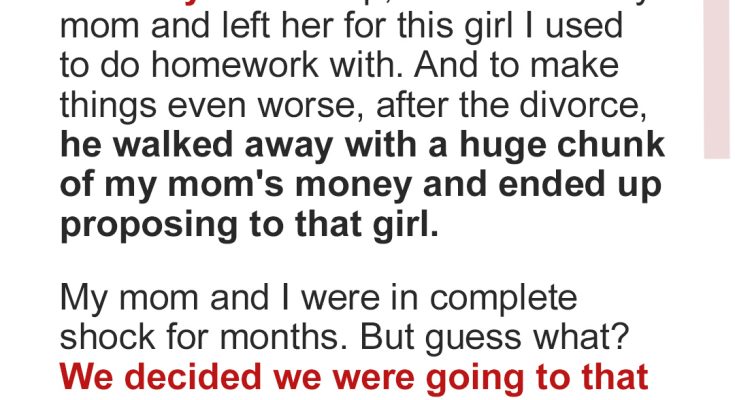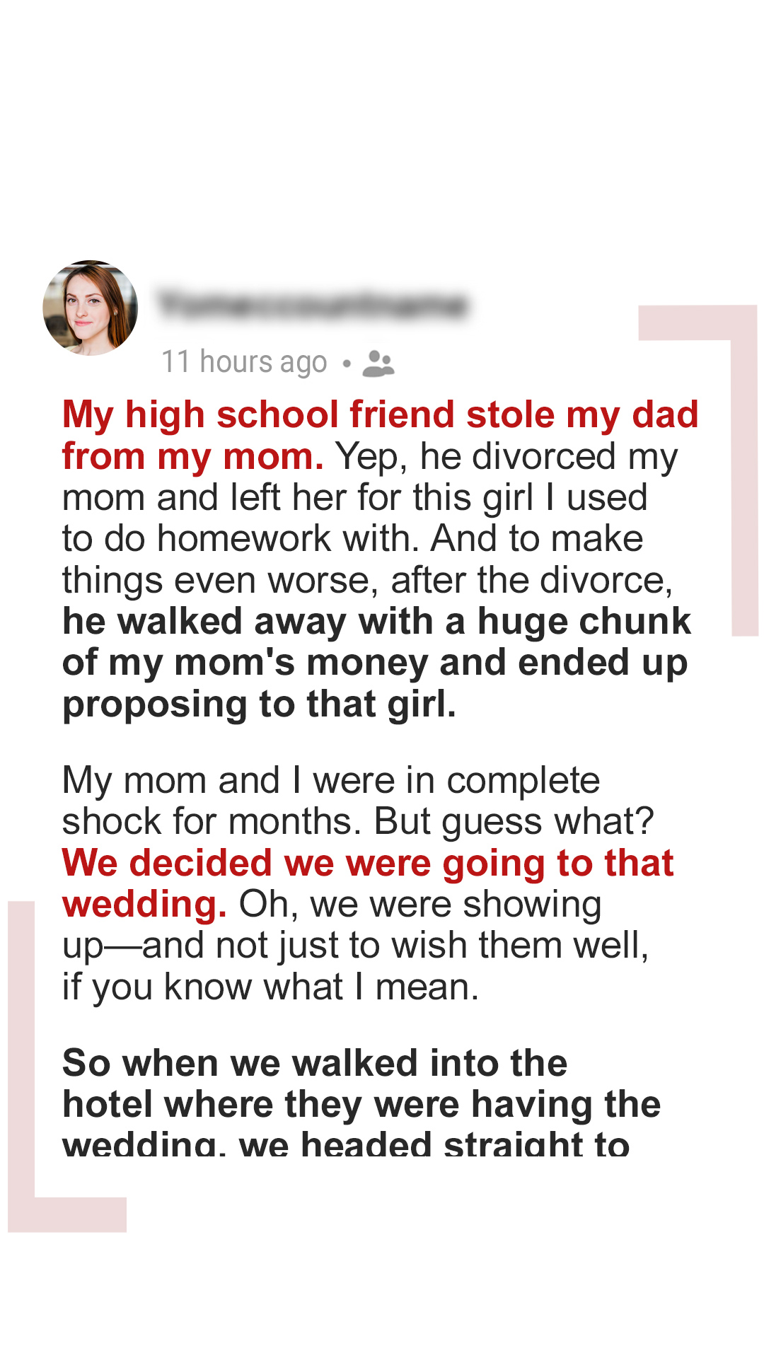 When my dad left my mom for my high school best friend, I thought the betrayal couldn’t get worse—until we got a wedding invite. We showed up dressed to impress, but we weren’t there to celebrate. We were there to expose everything. “My dad left my mom for my high school best friend.” I say it out loud sometimes, just to hear how insane it sounds. Emma. That was her name. She was my best friend since we were 10. We had sleepovers almost every weekend. She knew where we kept the spare key. She called my mom “Mama J.” And now she calls my dad “babe.” Let that sink in. Before everything fell apart, things at home were already… shaky.  Mom worked two jobs. One at the bank, one cleaning offices in the evening. She never complained. She made dinner. She packed my lunch. She paid every bill on time. Dad? Dad was “self-employed.” He said he was “editing photos.” What he really did was nap, play Xbox, and post long rants on Facebook about “finding your passion.” Money was always tight. Somehow, even tighter after he got paid. When the divorce happened, I thought he’d at least be fair. He wasn’t. He got himself a slick lawyer.
